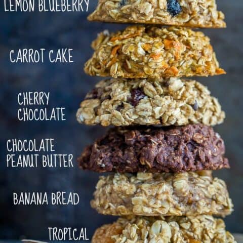 Sweets will be plentiful all month long. So again, keeping with the idea of a healthy gift to my future self, I like to get some whole-grain, protein-rich cookies or bars packed into the back of the freezer. These will be so appreciated towards the end of the month. Here are oatmeal based breakfast cookies made 6 ways. Perfect to breakfast with.