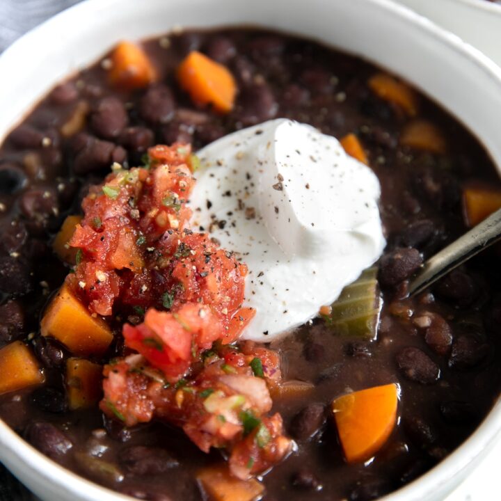 This Easy Black Bean Soup Recipe is made with basic pantry essentials including canned black beans, onion, carrots, and celery. Filled with hearty plant-based protein and gut-loving fiber, enjoy this healthy and delicious vegan soup with all your favorite toppings including salsa, sour cream, avocado, and more!