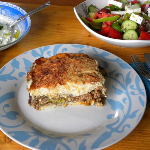 Moussakas, is a Greek casserole of layered sautéed slices of potatoes and eggplants (in some places they also add zucchini and tomatoes), with the meat sauce (either pork or veal) in the middle layer and topped with a lush layer of béchamel sauce and myzithra or graviera cheese, baked in the oven.