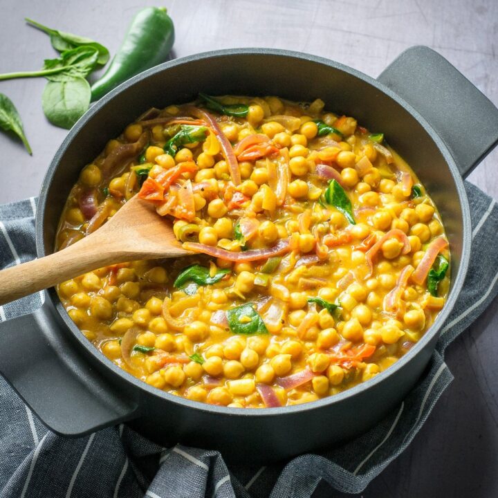 These quick and easy curried chickpeas and spinach make a flavour-packed and nutritious supper, with zingy lemon, Indian spices and a creamy coconut sauce.
