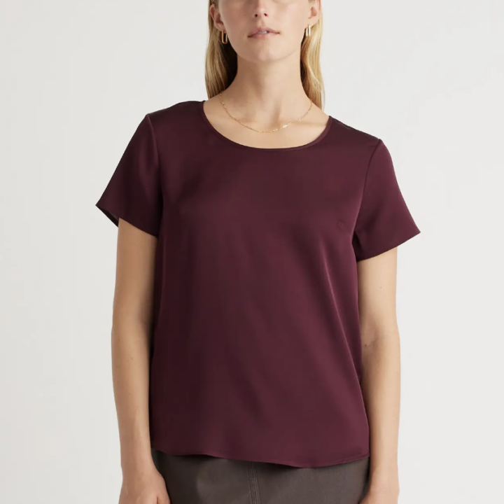 These basic t-shirts have a great stretch and tuck nicely too. They're really awesome for travel. I like the mock neck but there are other options too.