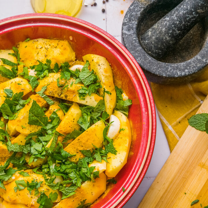 This flavorful lamb tagine features succulent pieces cooked with fragrant spices, potatoes, and peas. The dish is traditionally in a tagine, but a Dutch oven or casserole dish works well too.