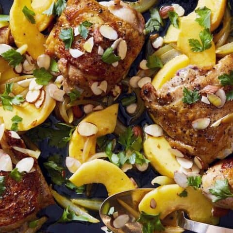 Pick your favorite cuts of chicken and enjoy this dish with fresh quince and almonds.